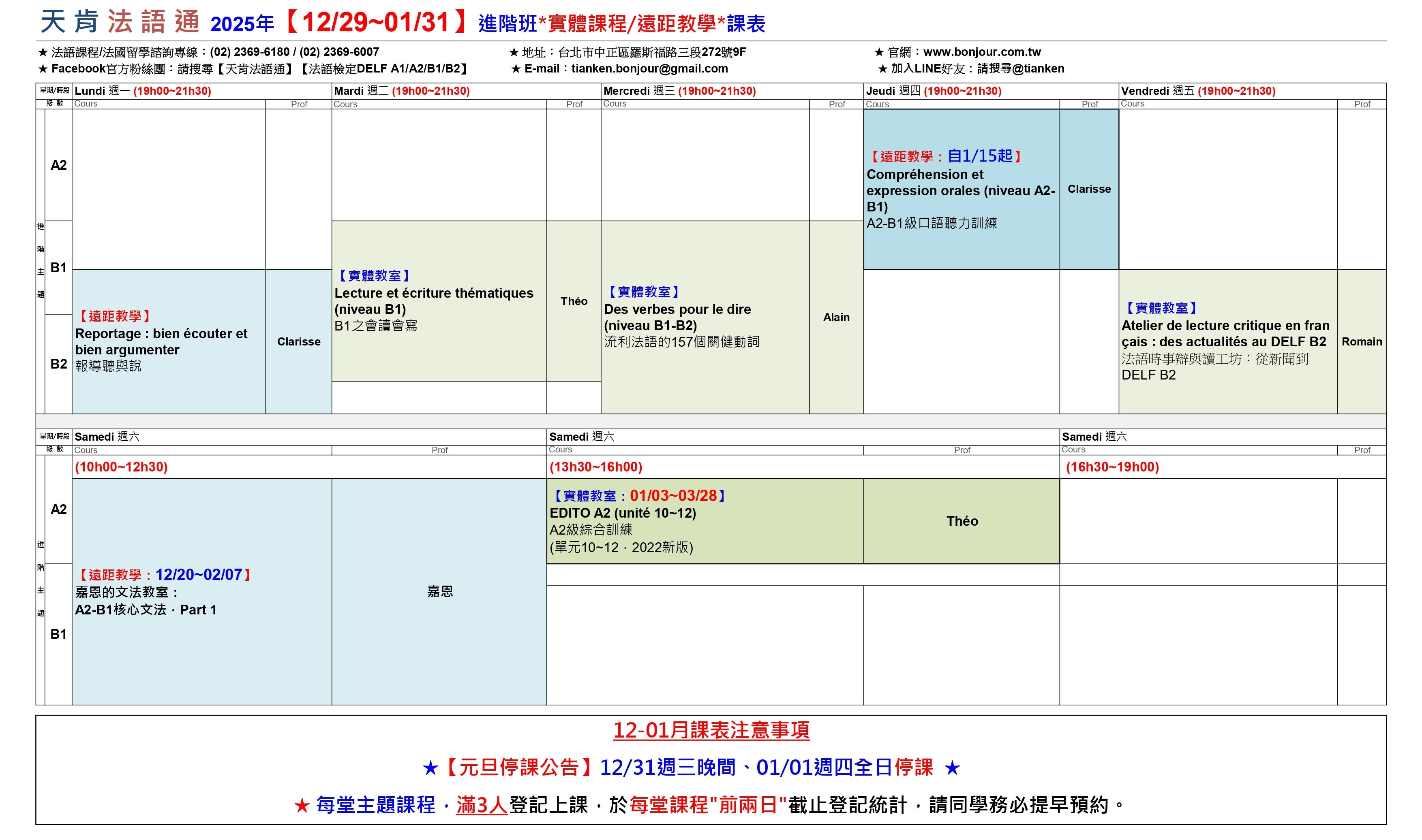 ★平日晚+週六早午課表放大請點此 : 2025/12/29~2026/01/31